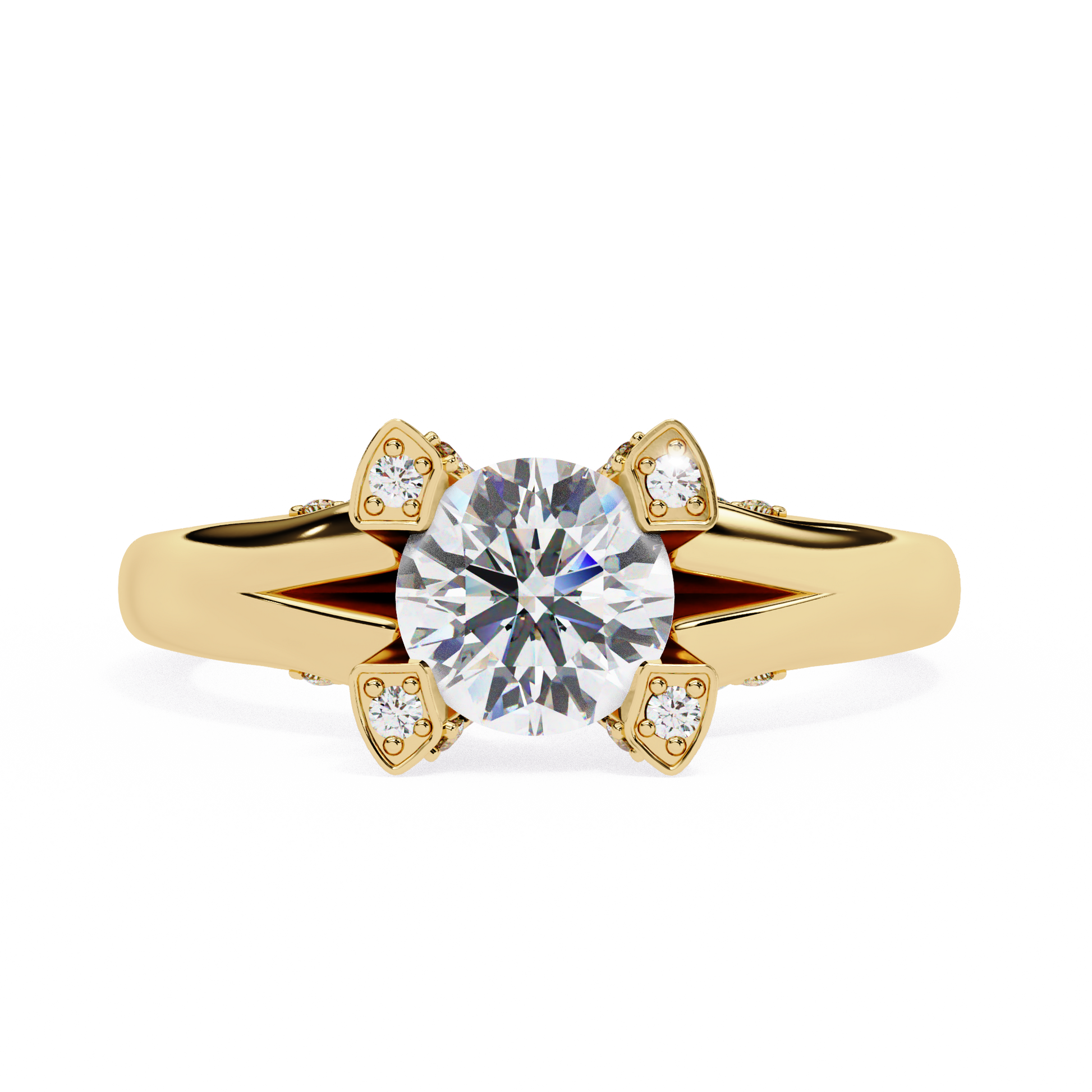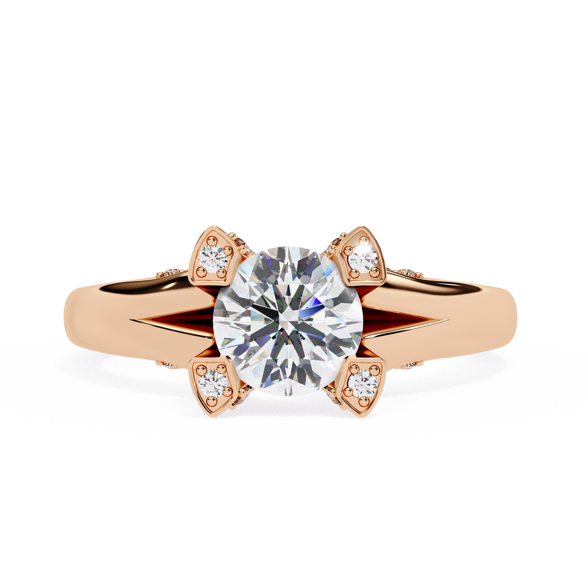 The Ember Engagement Ring radiates charm and sophistication. Showcasing a 0.9-carat round-cut lab-grown diamond at its center, this ring is a true testament to timeless beauty. The classic 4-prong setting highlights the brilliance of the center stone, allowing light to reflect beautifully from every angle.