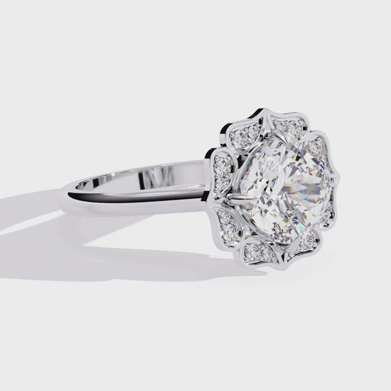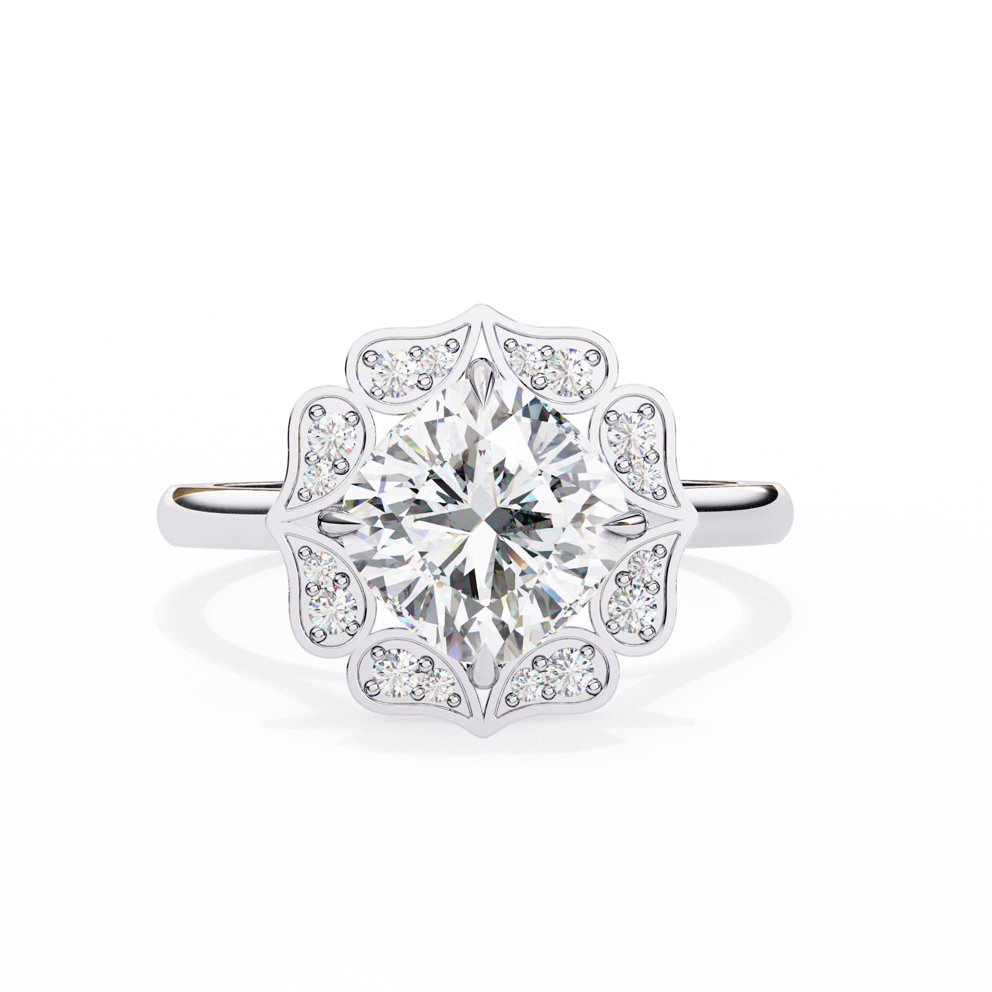 The Liliana Engagement Ring is a breathtaking symbol of love and luxury. At its heart is a magnificent 3.36-carat cushion-cut lab-grown diamond, renowned for its elegant rounded corners and brilliant sparkle. The cushion cut’s timeless shape creates a soft yet striking presence, allowing the diamond to reflect light from every angle, creating a captivating play of brilliance and fire.